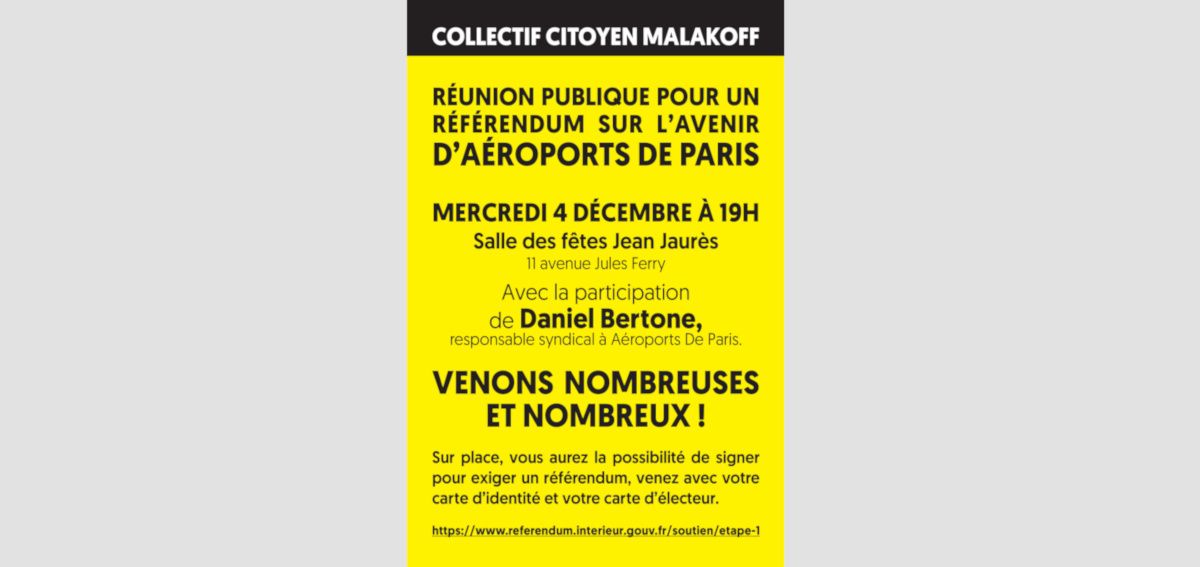 Référendum ADP – Je signe ! Réunion publique le 4 décembre à Malakoff par Parti Socialiste Malakoff · Publié 22/11/2019 Pour signer c’est ici : www.referendum.interieur.gouv.fr/soutien TRACT-AEROPORTS-ADP Partagez !